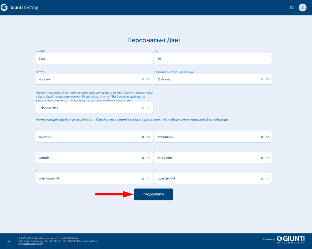 1. Заповніть персональні дані персони, що проходить тестування, і натисніть на кнопку “Продовжити”
