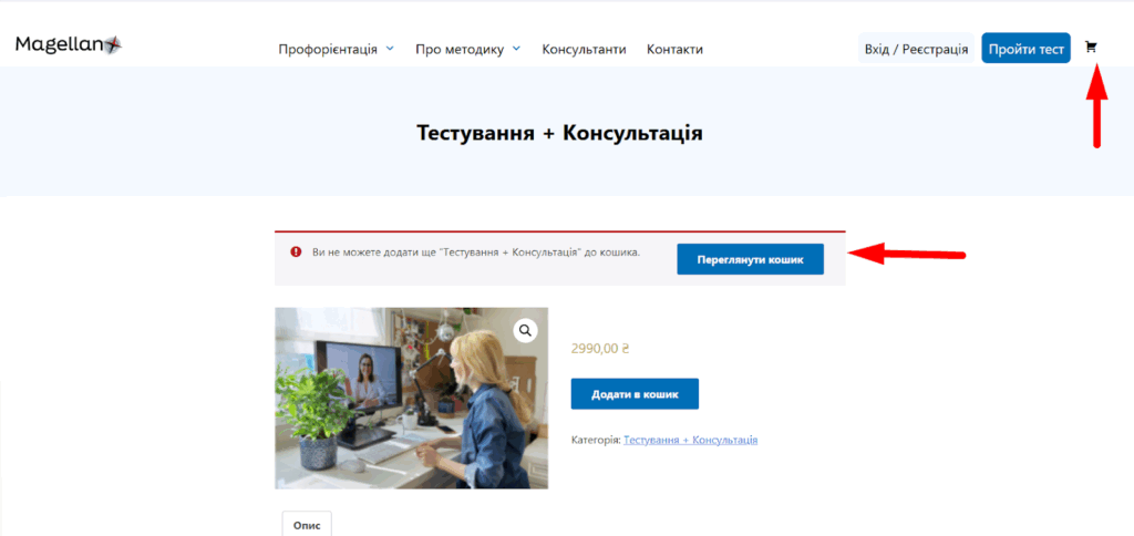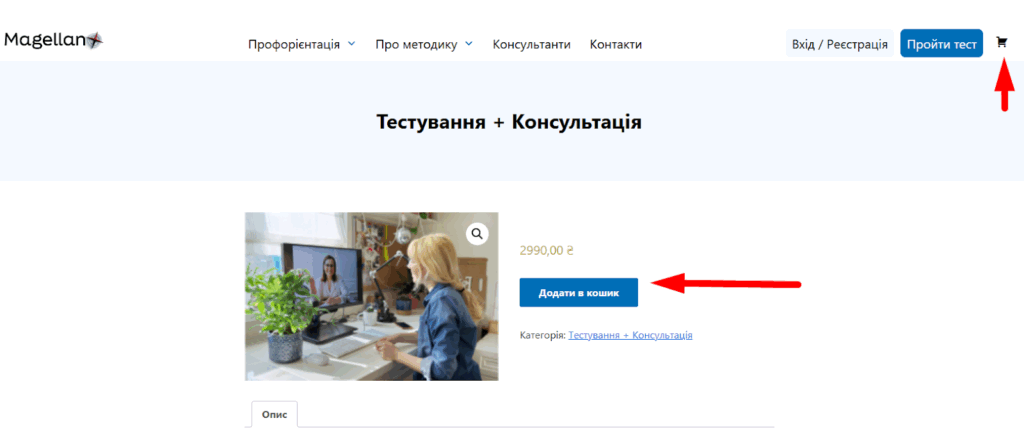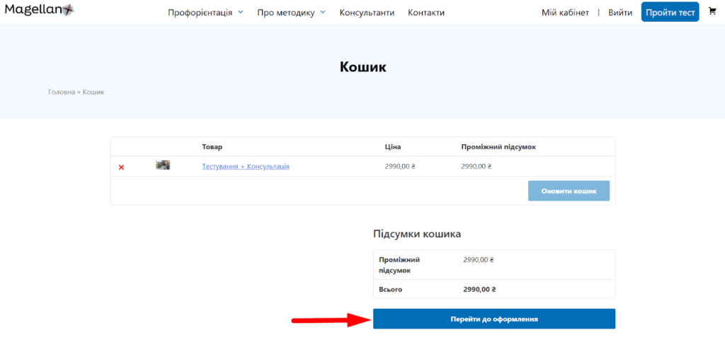 1. Після додавання тесту в кошик, сайт автоматично спрямує вас на сторінку оформлення товару. Якщо цього не трапиться, натисніть на іконку кошика у правому верхньому куті сайту або на кнопку “Переглянути кошик на сторінці товару”