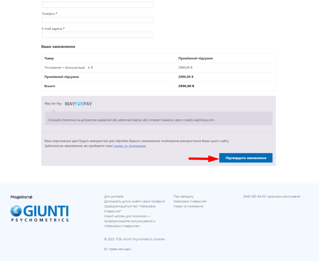 1. На сторінці оформлення замовлення заповніть всі необхідні поля і підтвердіть замовлення, натиснувши на кнопку “Підтвердити замовлення” внизу сторінки