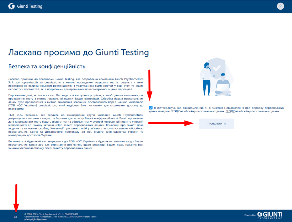 1. Оберіть мову тесту, дайте згоду на обробку даних і натисніть на кнопку “Продовжити”